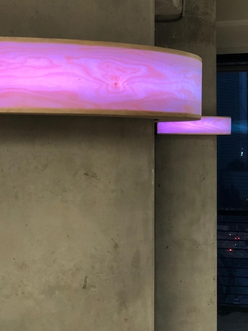 The dynamic digital wood rings is an ever changing light installation, the rings colour changes throughout the day, creating a light show every round hour.
